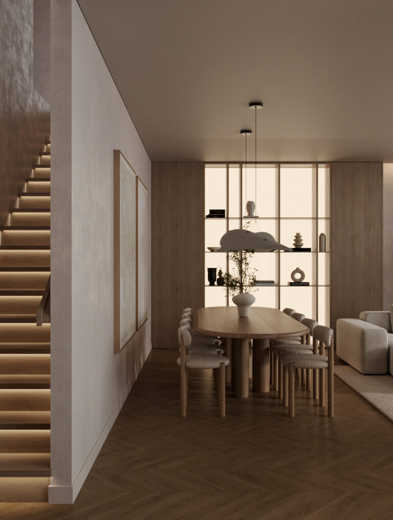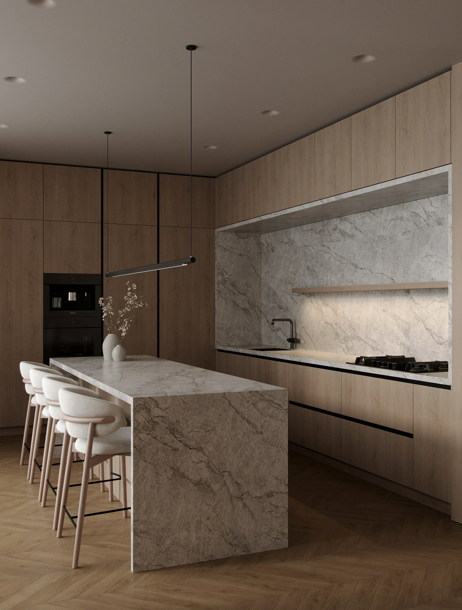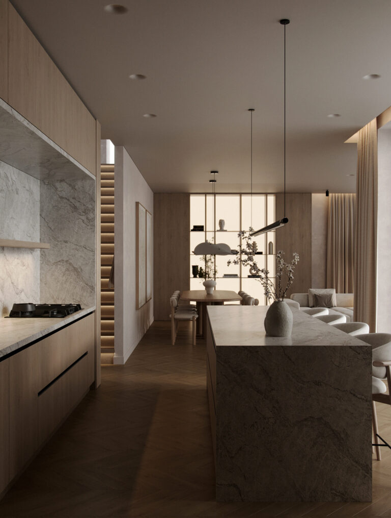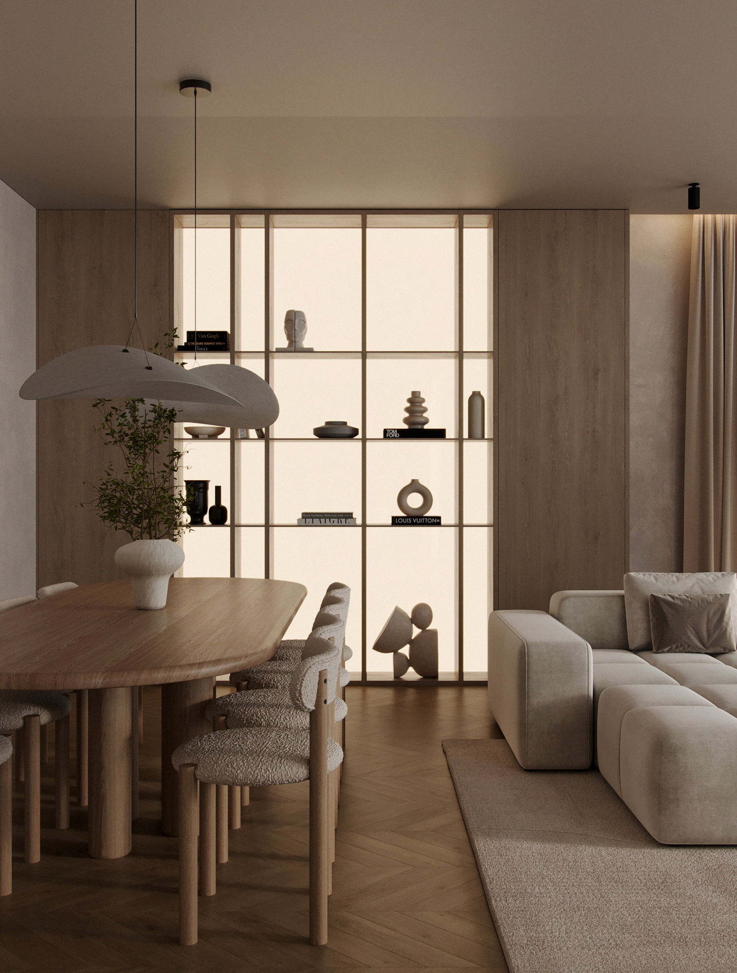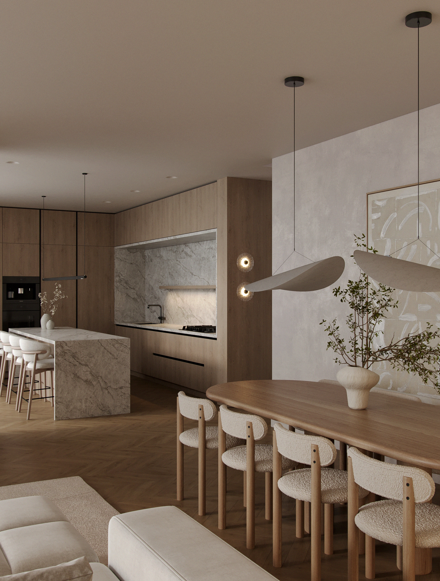 This interior project blends modern luxury with natural warmth, creating a timeless open-plan living and dining space. The design features a seamless combination of natural oak wood, soft neutral fabrics, and elegant stone finishes. A sculptural marble island anchors the kitchen, while bespoke lighting and organic textures enhance the sense of harmony. Minimalist yet inviting, this project celebrates calm sophistication and understated elegance.