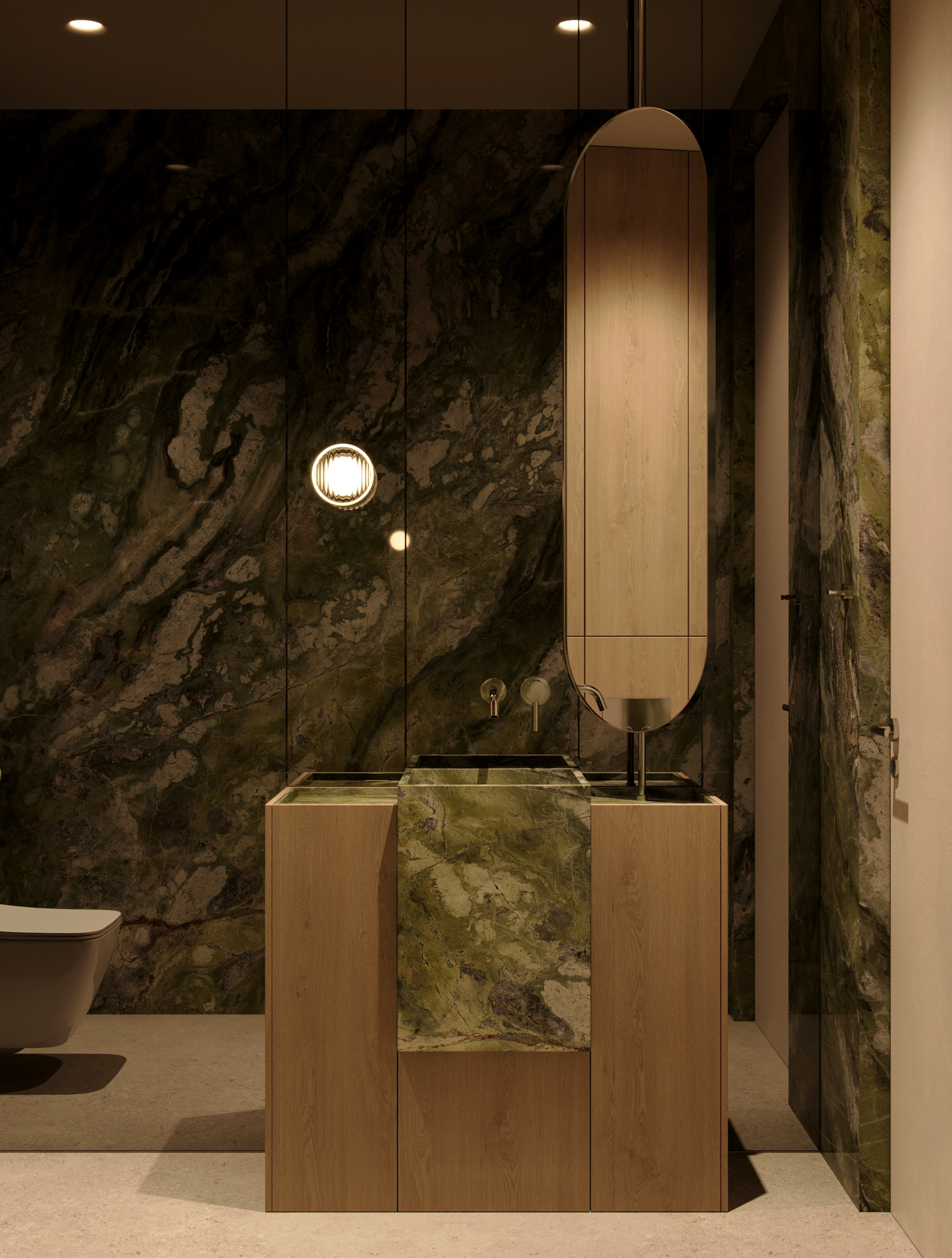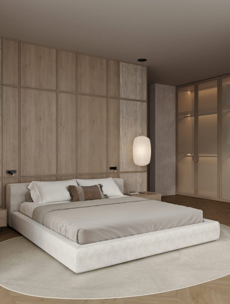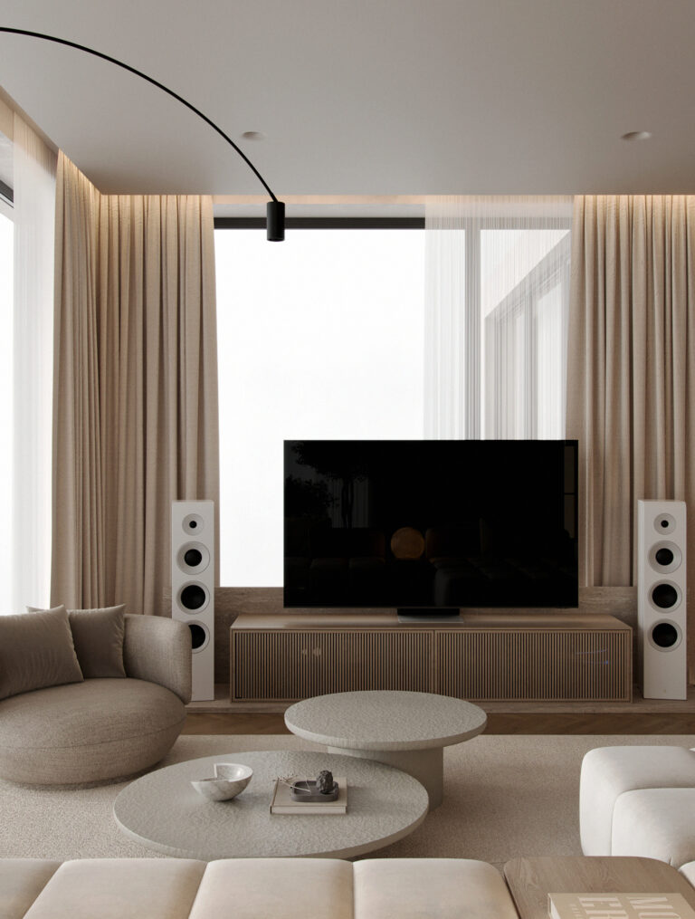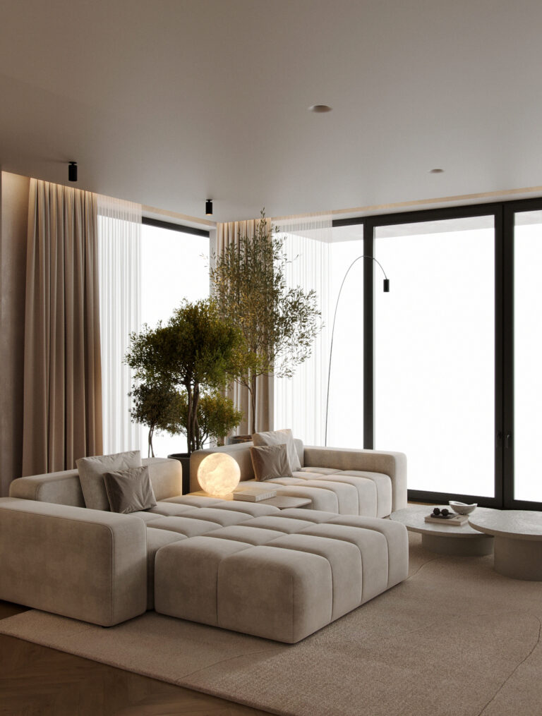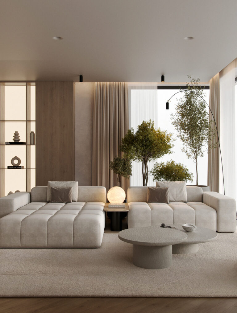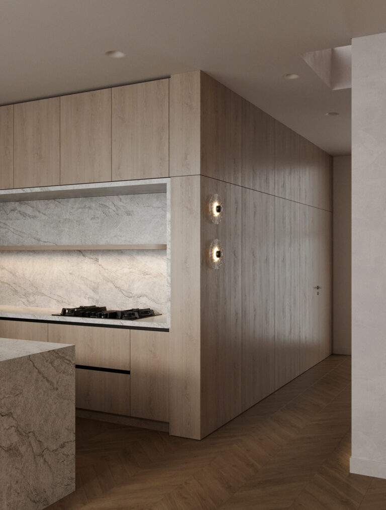 This interior project blends modern luxury with natural warmth, creating a timeless open-plan living and dining space. The design features a seamless combination of natural oak wood, soft neutral fabrics, and elegant stone finishes. A sculptural marble island anchors the kitchen, while bespoke lighting and organic textures enhance the sense of harmony. Minimalist yet inviting, this project celebrates calm sophistication and understated elegance.